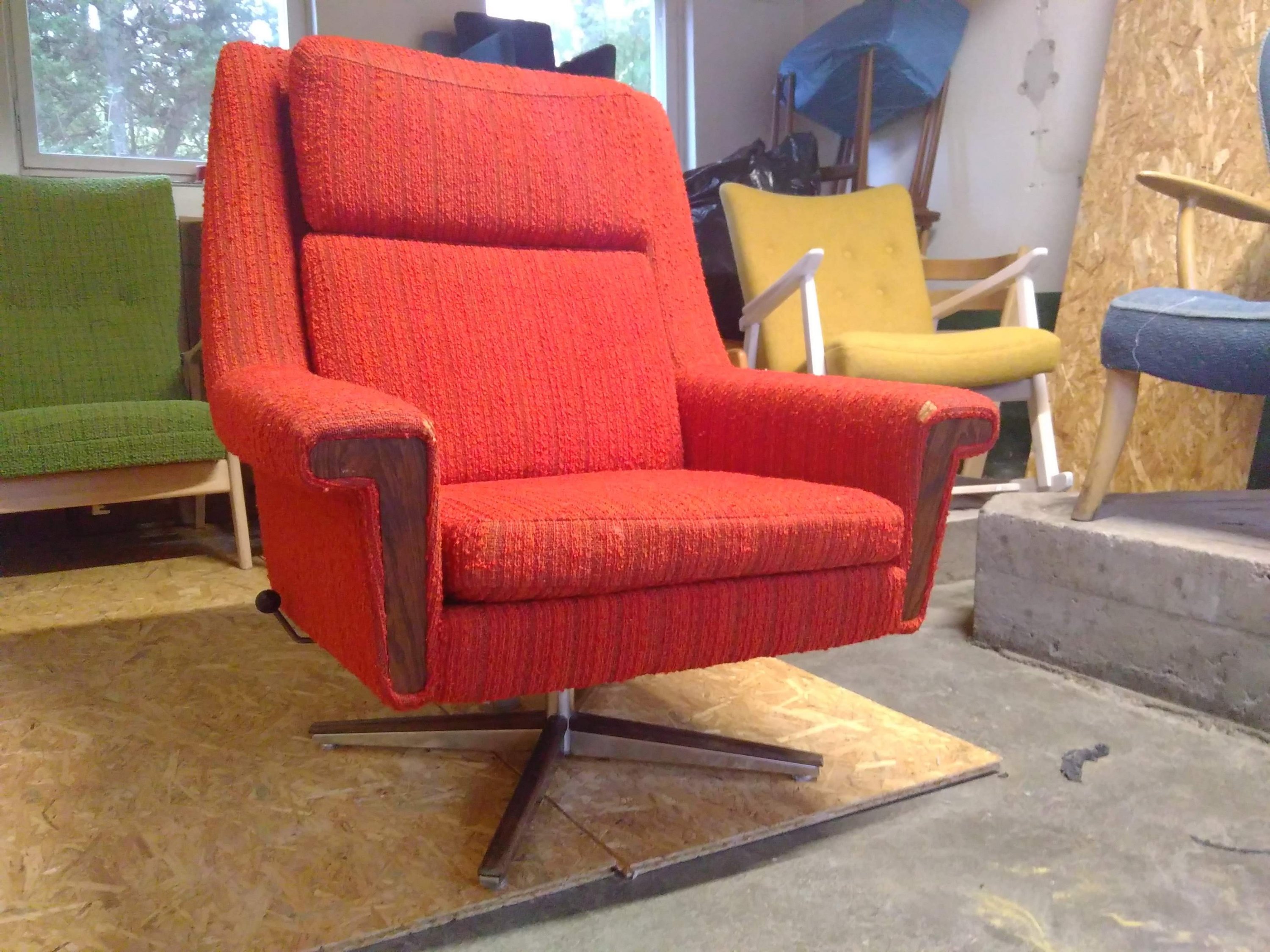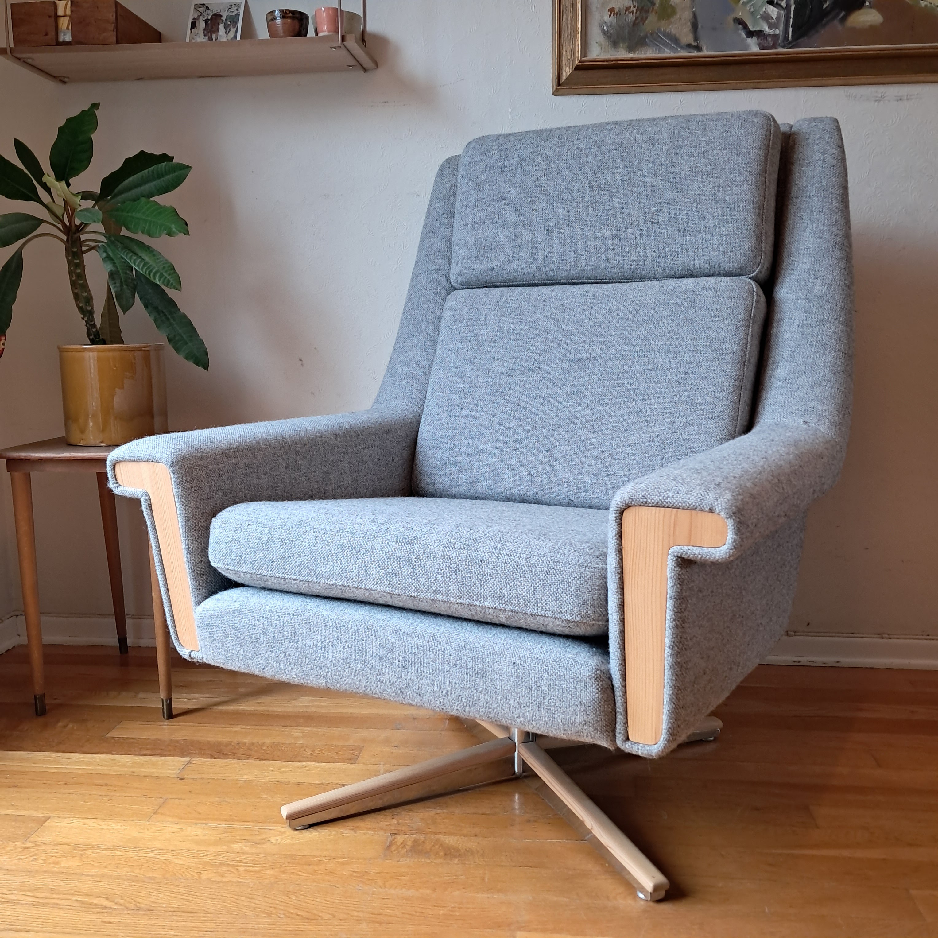 Salve er en stol i grå ull og lys furu som er til salgs her på Norges kanskje mest progressive gjenbruksblogg. Det kan bety flere ting. Blant annet at du kan gjøre stua stor igjen, men også noe så enkelt som at jeg er en reparatør. Det er i tiden, vidløftige og store forestillinger sammen med reparasjon og gjenbruk. Jeg flyr i spissen av fugleglokken, en pil som peker inn i framtida.